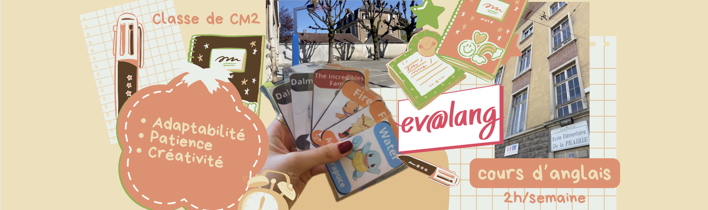 Durant mon deuxième semestre de BUT 2, j’ai donné à hauteur de 2 heures par semaine des cours d’anglais à une classe de CM2. Cette opportunité m’as été présenté dans le cadre d’une « Unité d’Enseignement libre » à travers le dispositif Ev@lang.